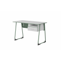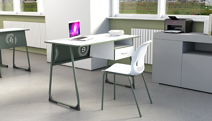 С правой стороны расположена полка с выдвижным ящиком для хранения учебных материалов, а лицевая панель с перфорацией и логотипом придаёт конструкции современный вид.