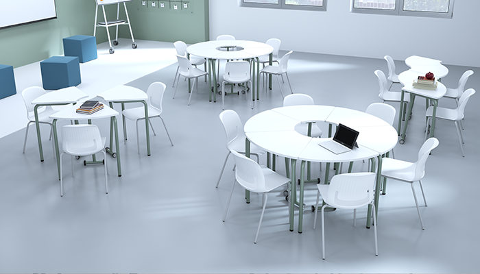 FLAP подходят для обустройства помещений и творческих пространств различных размеров и нестандартной планировки. Их уникальная форма столешницы – трапециевидная с закругленными углами – образует круг, когда столы установлены вплотную друг к другу (6 секций). Не регулируются по высоте, но могут быть изготовлены в определенной ростовой группе. Благодаря колесикам столы легко перемещаются, а также компактно складываются в горизонтальную стопку, экономя место. Столешницы изготовлены из качественного ДСП S=18мм с кромкой ПВХ и пластиковым покрытием. Поверхность столов антибликовая, что предотвращает отражение света.