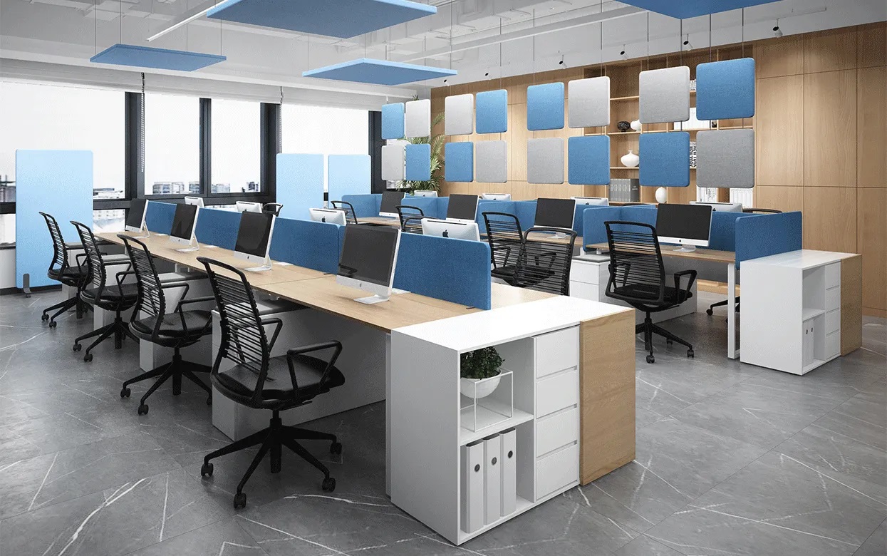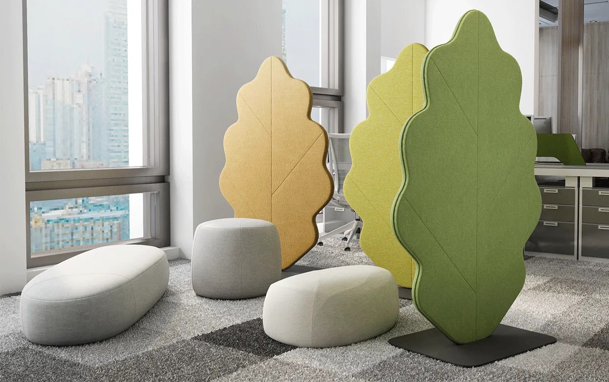 Серия «АКУСТИК» является идеальным решением для опен спейс пространств, в которых необходимо совместить принципы открытой планировки и тихие и конфиденциальные зоны без отвлекающих факторов. «АКУСТИК» включает в себя различные шумоподавляющие решения, начиная с настольных экранов, заканчивая фигурными напольными панелями.