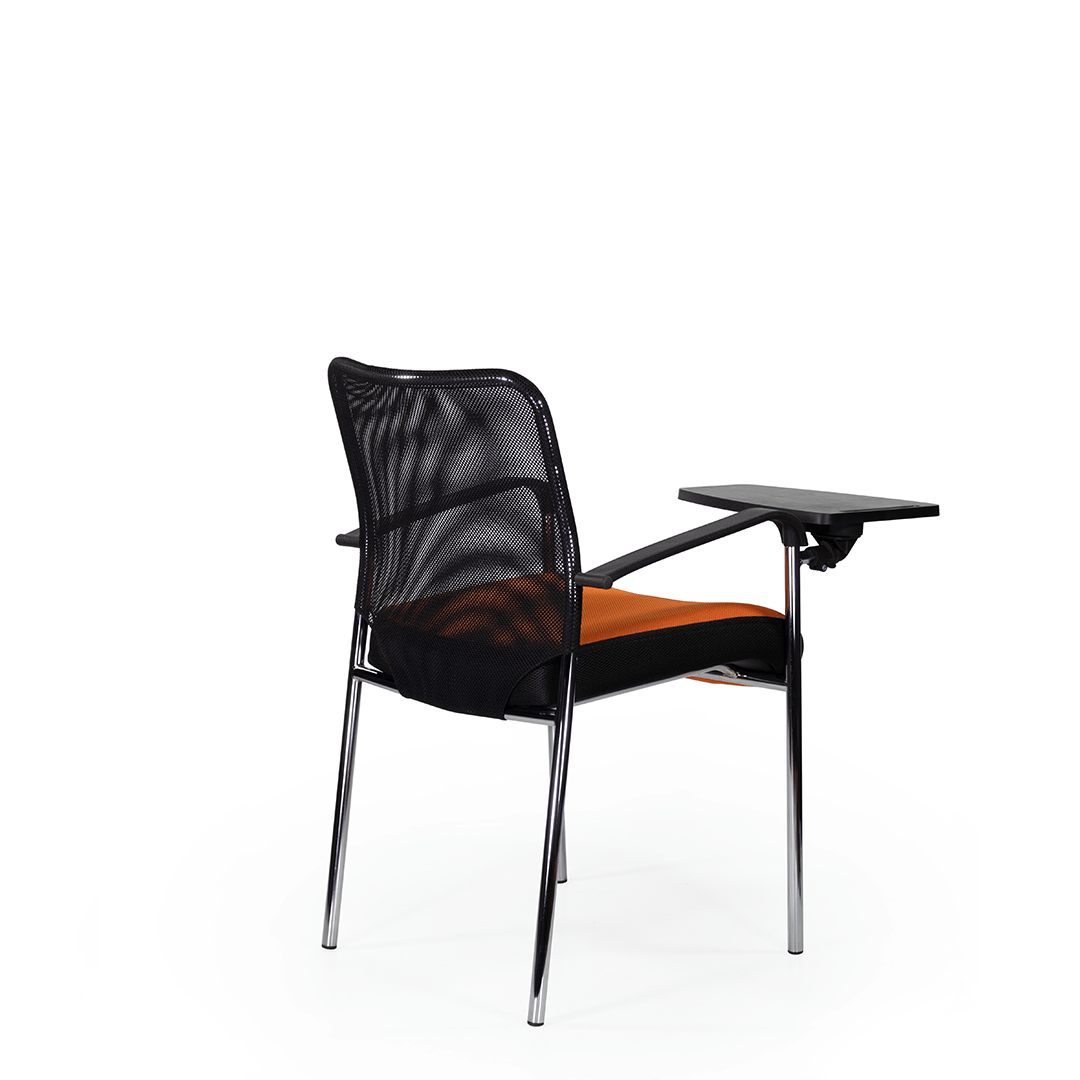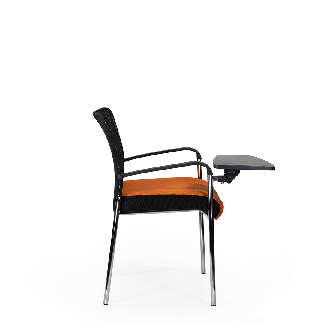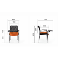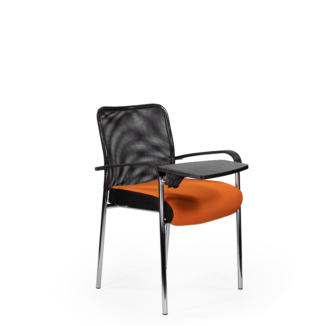 Кресло для посетителя изготавливается с мягким сиденьем, оригинальной спинкой, выполненной из сетчатой ткани и пластиковыми подлокотниками.