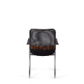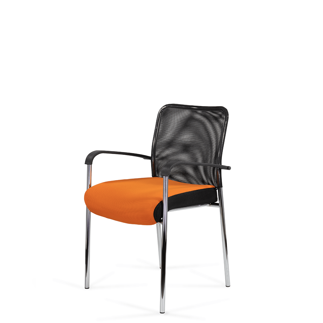 Кресло для посетителя изготавливается с мягким сиденьем, оригинальной спинкой, выполненной из сетчатой ткани и пластиковыми подлокотниками.