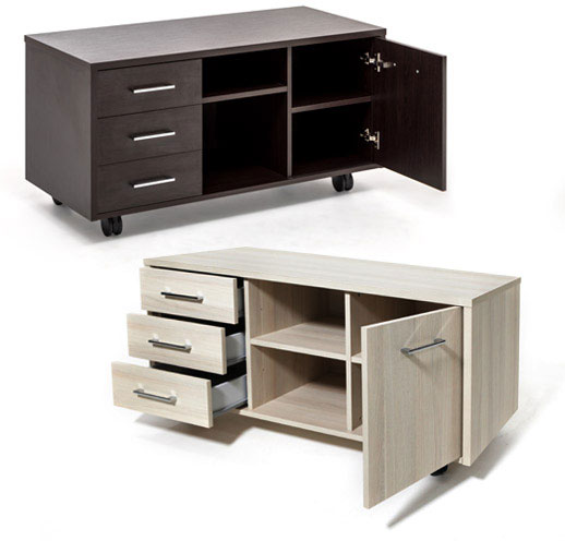 Система хранения представлена низкими шкафами высотой 77 см и высокими шкафами высотой 182 см. Каркасы шкафов, в том числе и задняя стенка, выполнены из ЛДСП толщиной 18 мм в цвете коллекции.