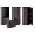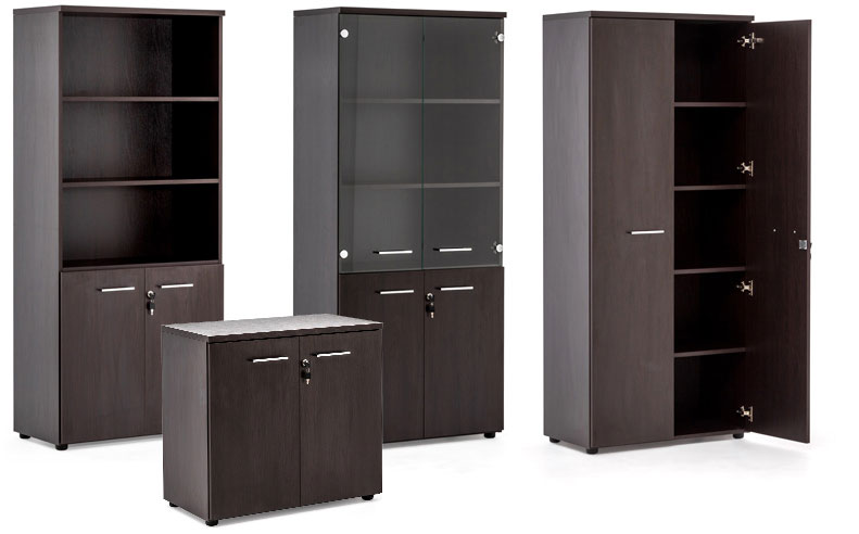 Система хранения представлена низкими шкафами высотой 77 см и высокими шкафами высотой 182 см. Каркасы шкафов, в том числе и задняя стенка, выполнены из ЛДСП толщиной 18 мм в цвете коллекции.