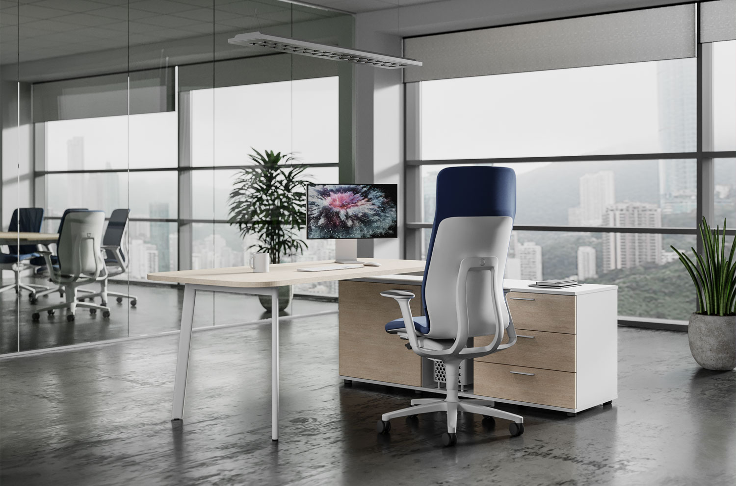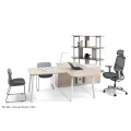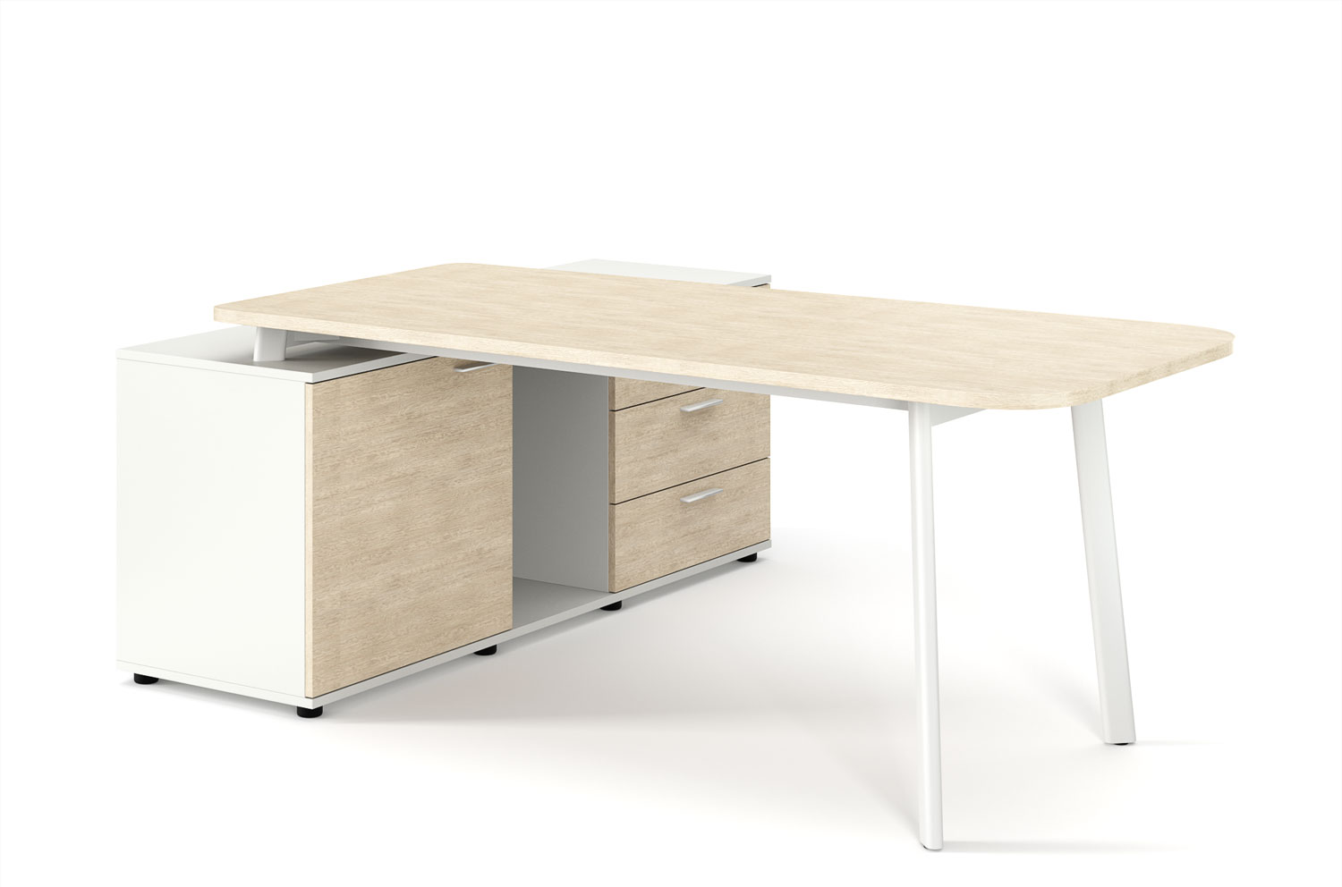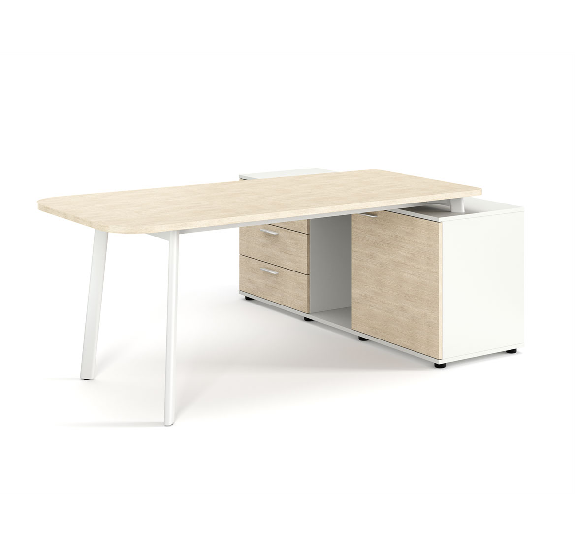 Опорная тумба может быть установлена как справа, так и слева, при этом столешница трапециевидной формы всегда крепится к опорной тумбе короткой стороной.