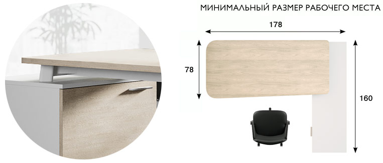 В складском ассортименте столы представлены с трапециевидными ассиметричными столешницами. Длина 1780 мм. Глубина — 780 и 840 мм. Все углы столешницы скруглены: со стороны тумбы – R50 мм, с внешней стороны – R150 мм