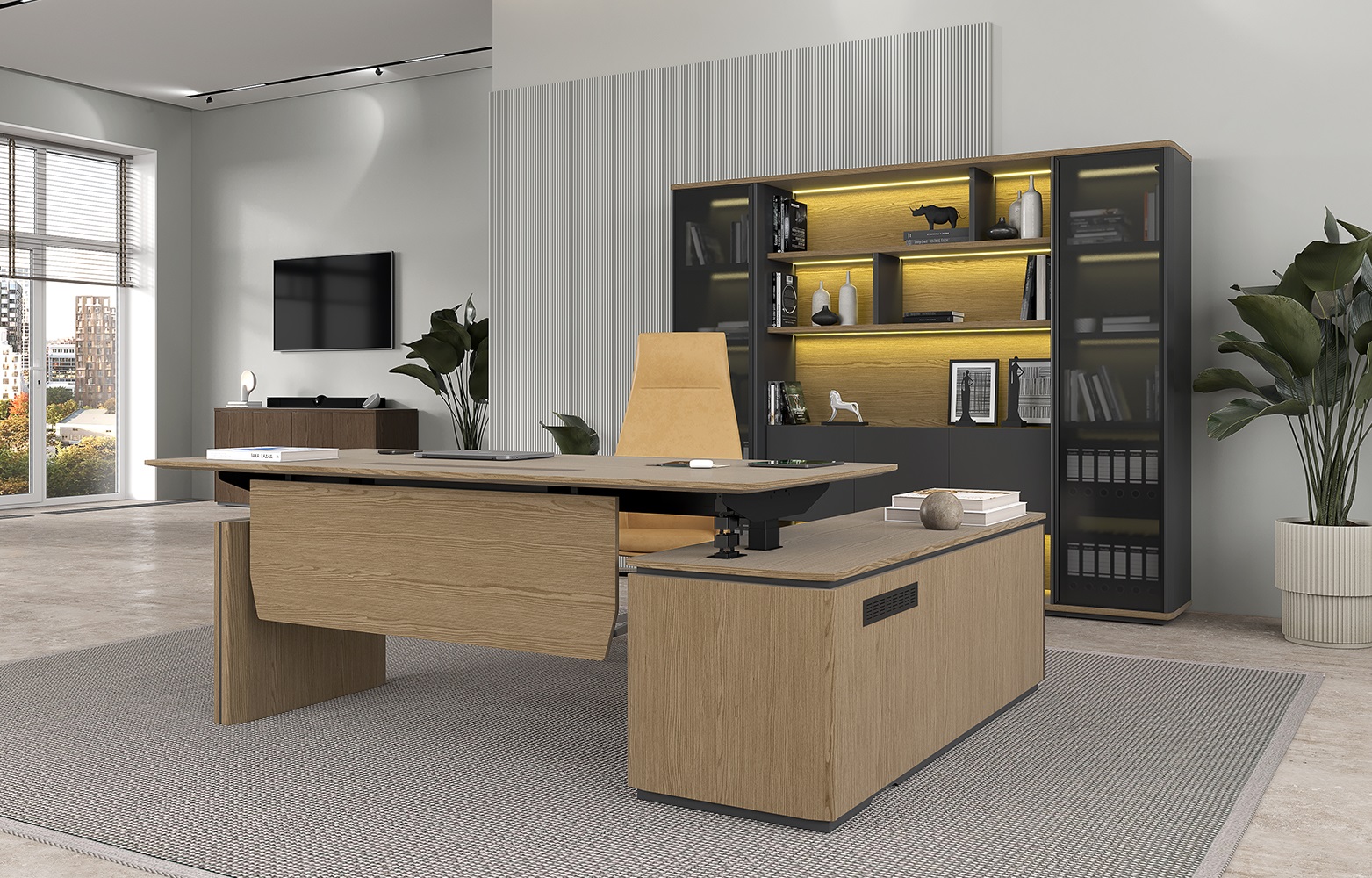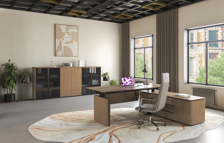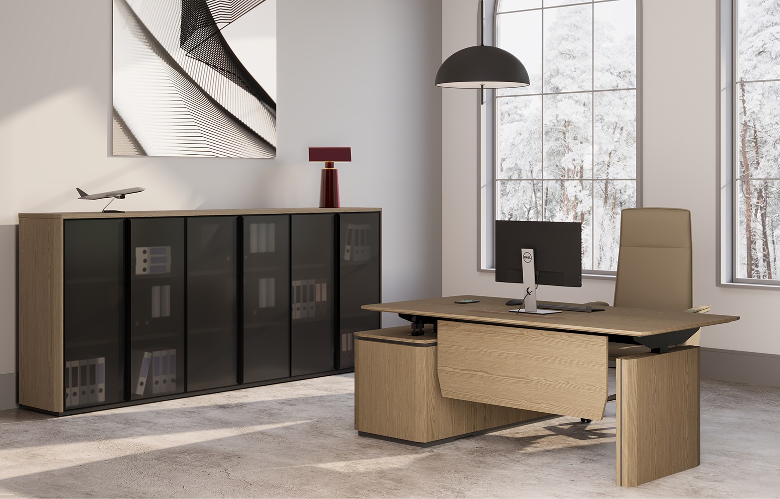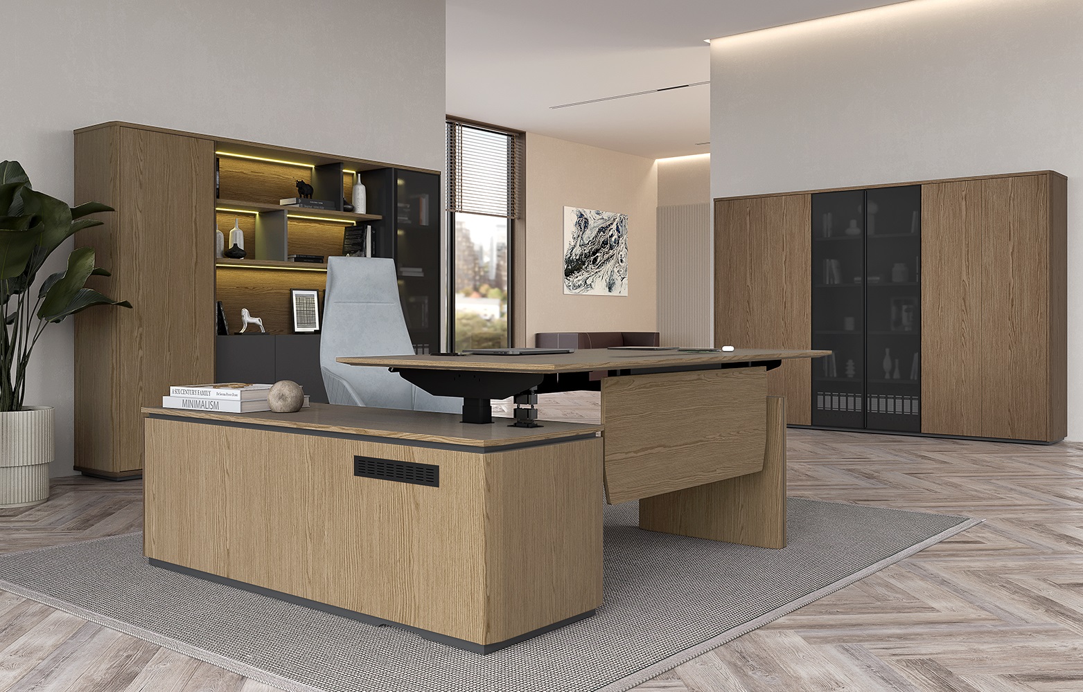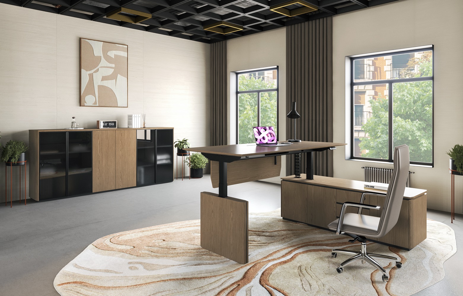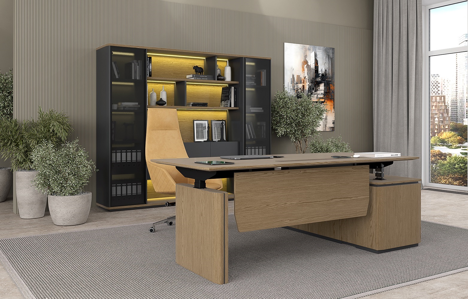 Подъемный электрический механизм в столах руководителя для работы «сидя-стоя» с памятью четырёх уровней высоты, которые легко устанавливаются кнопками, что создает дополнительный комфорт в течении рабочего дня.