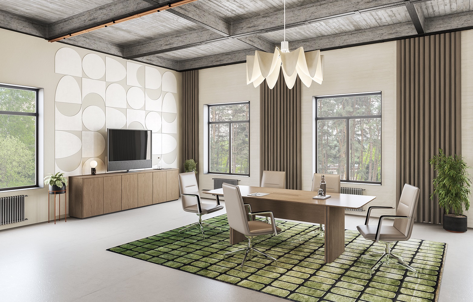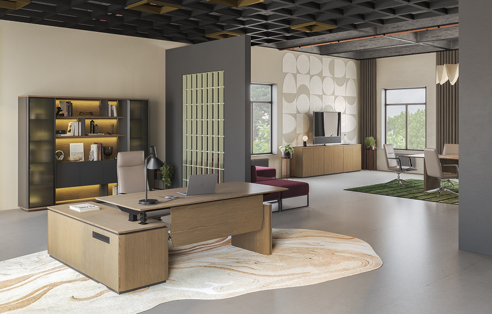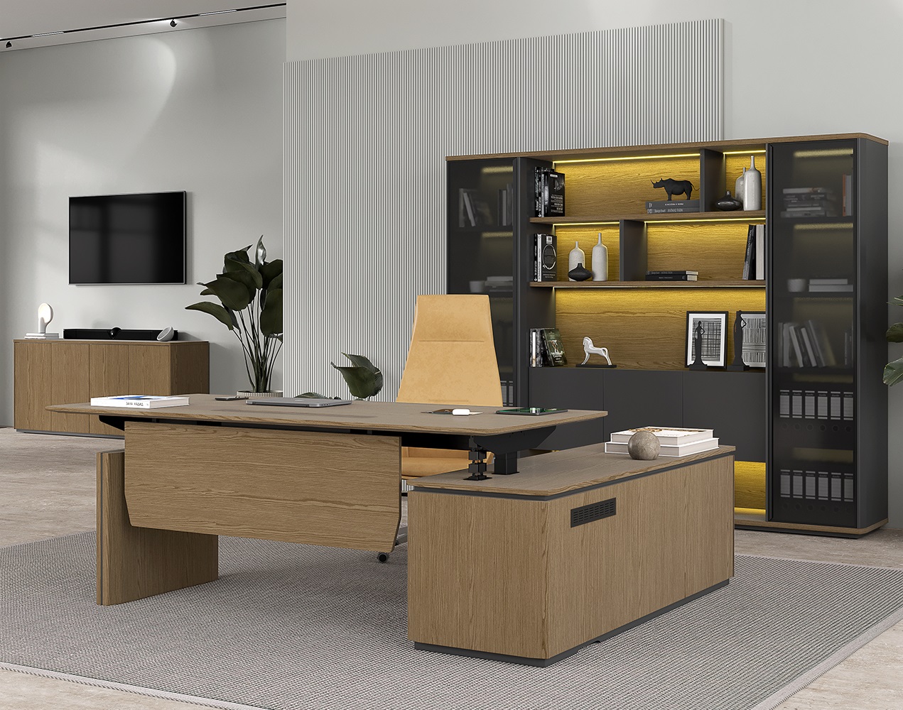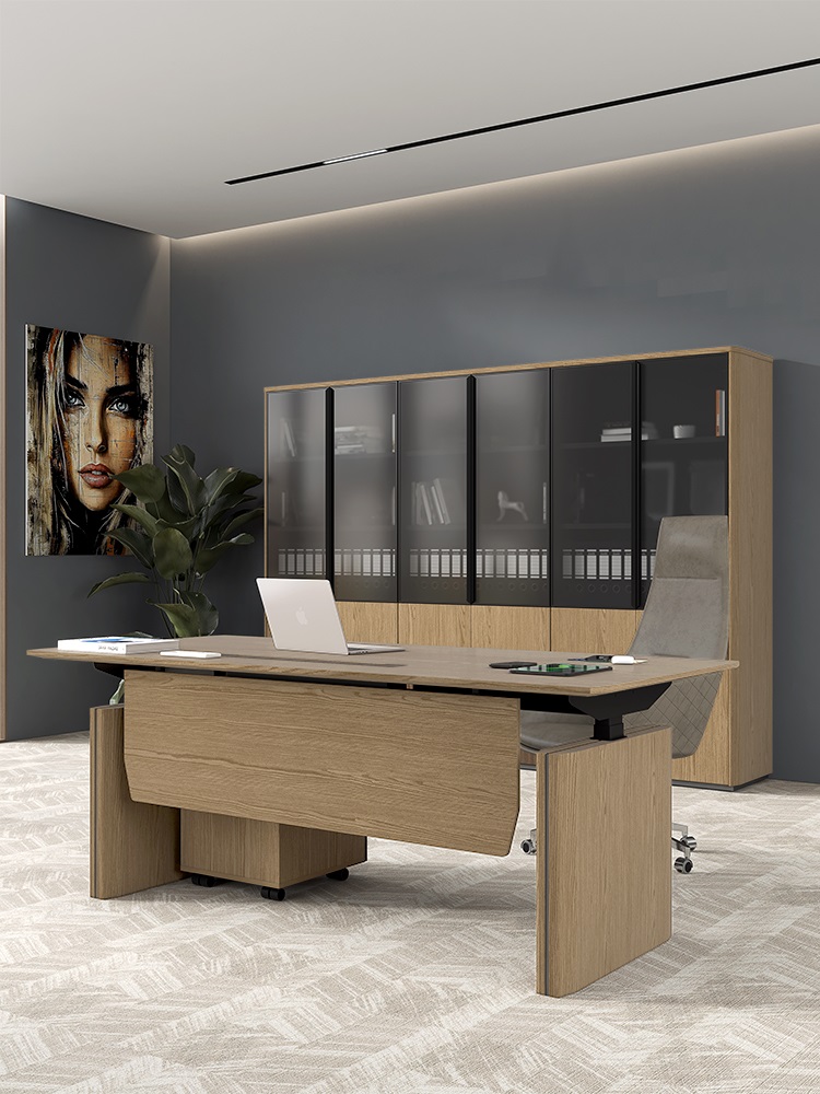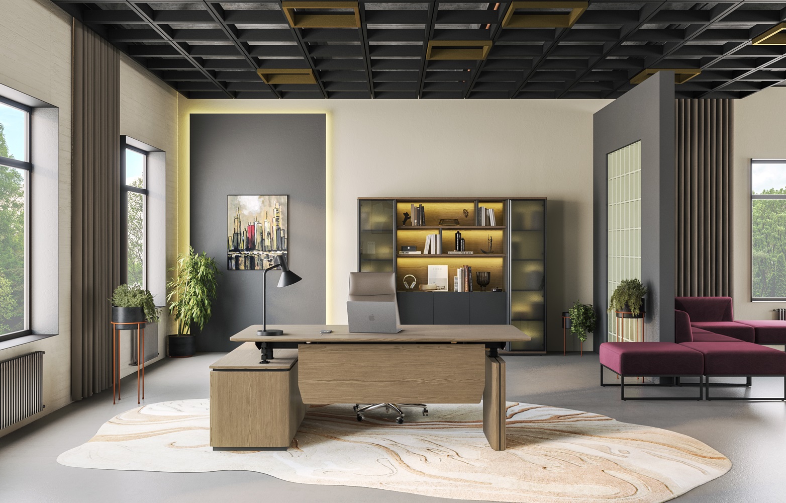 Подъемный электрический механизм в столах руководителя для работы «сидя-стоя» с памятью четырёх уровней высоты, которые легко устанавливаются кнопками, что создает дополнительный комфорт в течении рабочего дня.