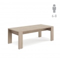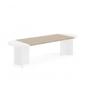 Стол размером 220х100 см имеет прямые опоры, объединенные с частью столешницы поперечным направлением рисунка дерева, отличным от продольного рисунка на центральной части столешницы.