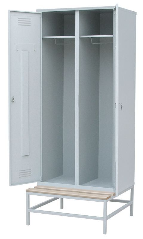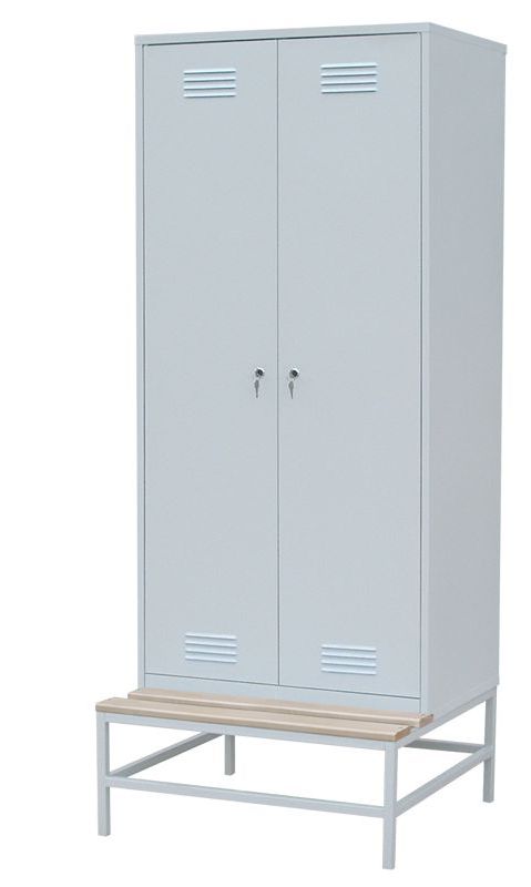 Указана оптовая цена за Шкаф для одежды на подставке с деревянной скамьей 2000x600x770 при единовременной закупке продукции в количестве от 100 штук в базовом исполнении.