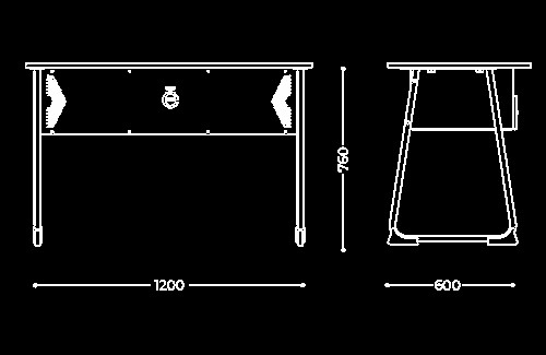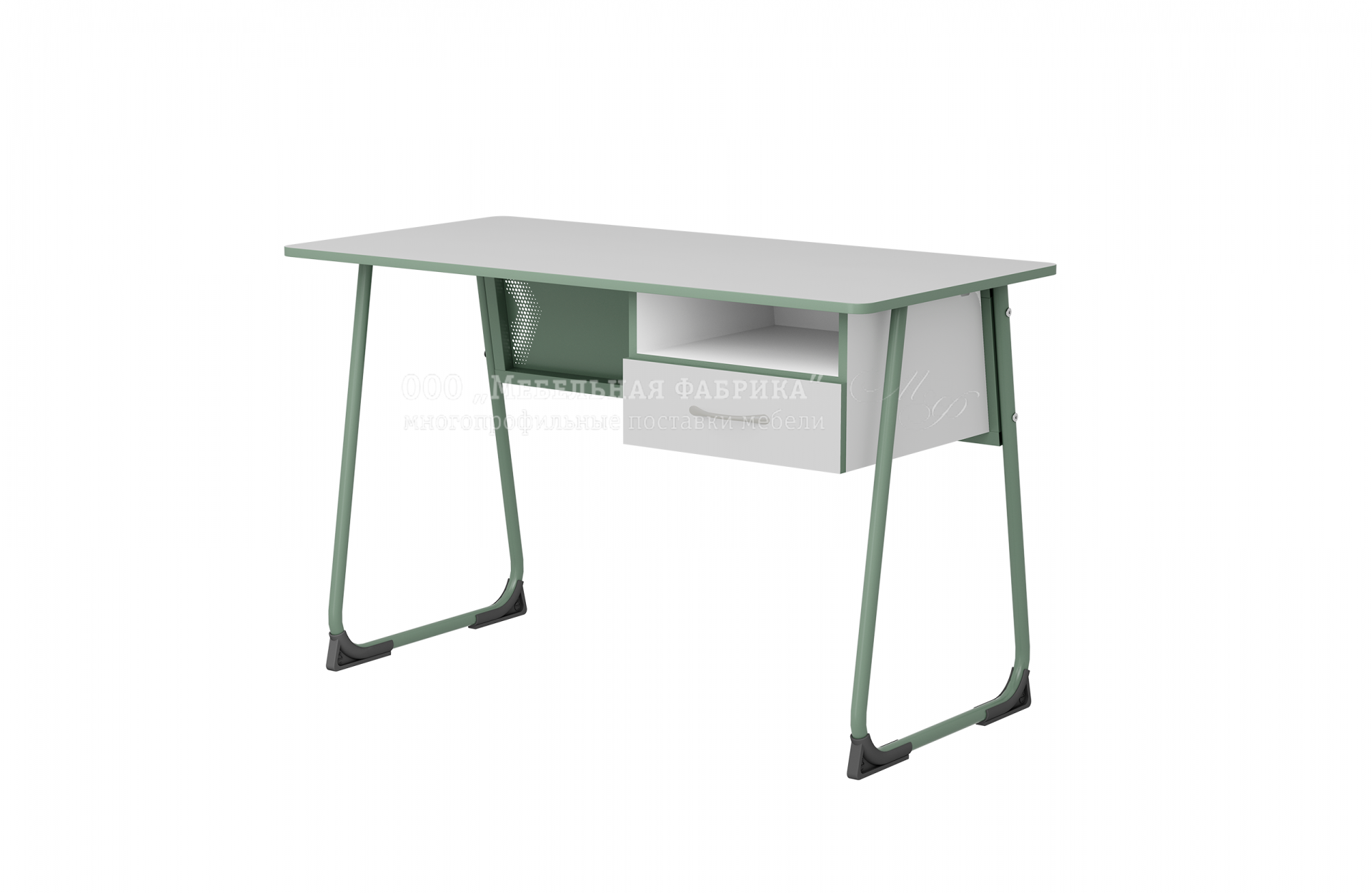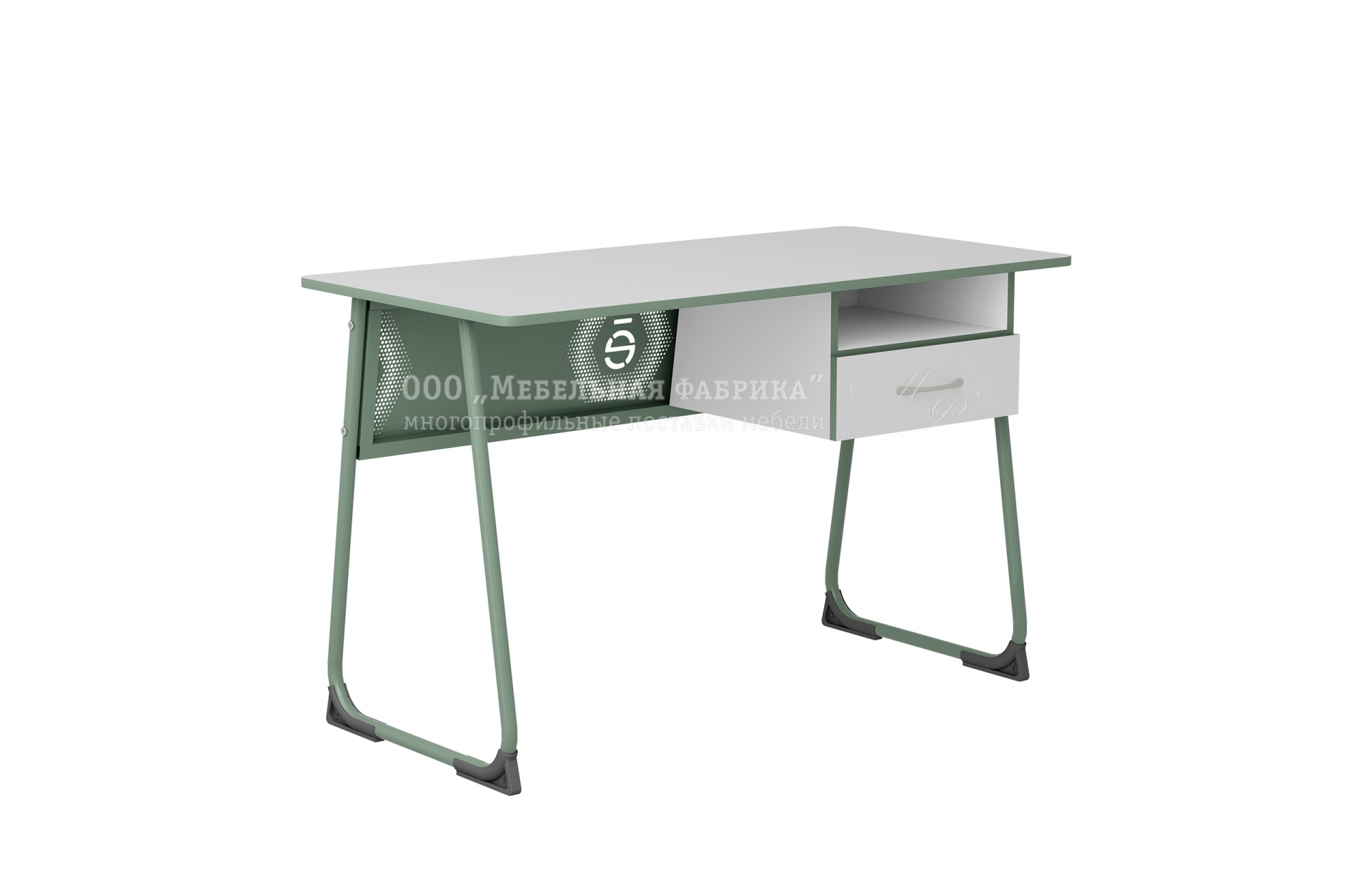 С правой стороны расположена полка с выдвижным ящиком для хранения учебных материалов, а лицевая панель с перфорацией и логотипом придаёт конструкции современный вид.