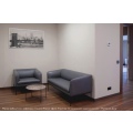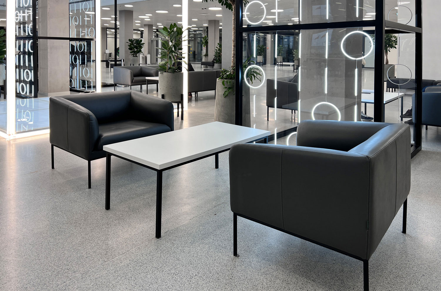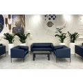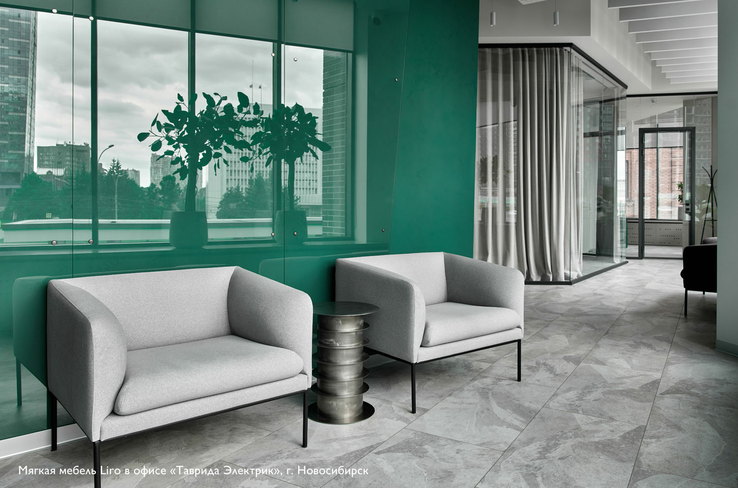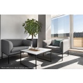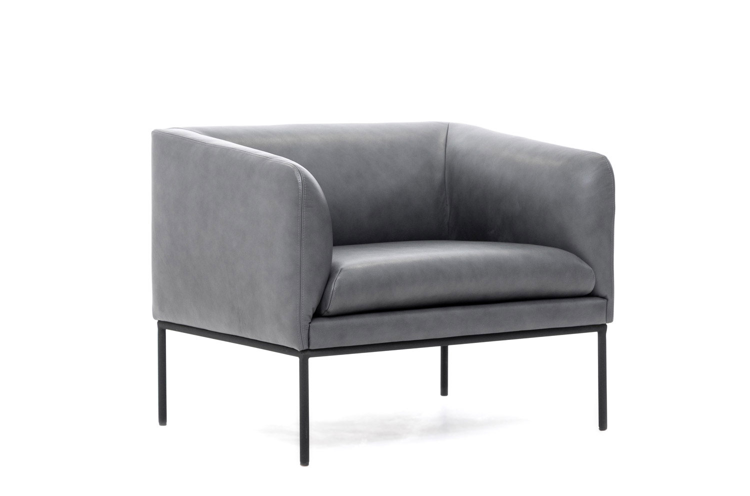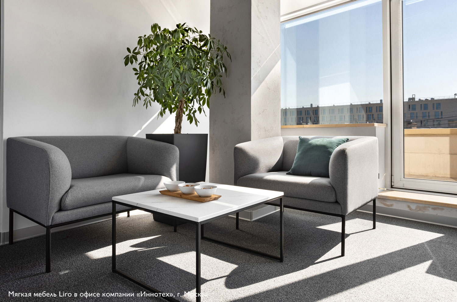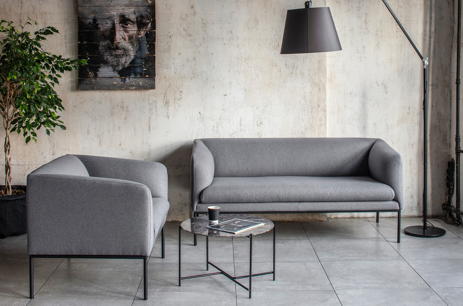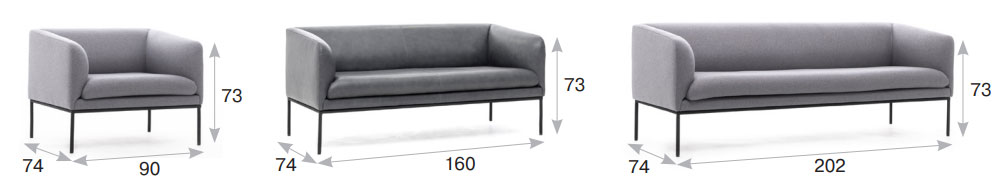 Коллекция "Liro" в складском ассортименте представлена двухместным диваном и креслом, выполненными в шерстяной ткани или коже серого цвета в сочетании с черными стальными опорами.