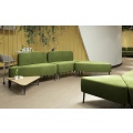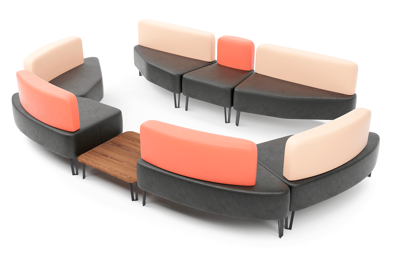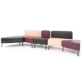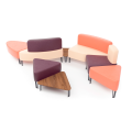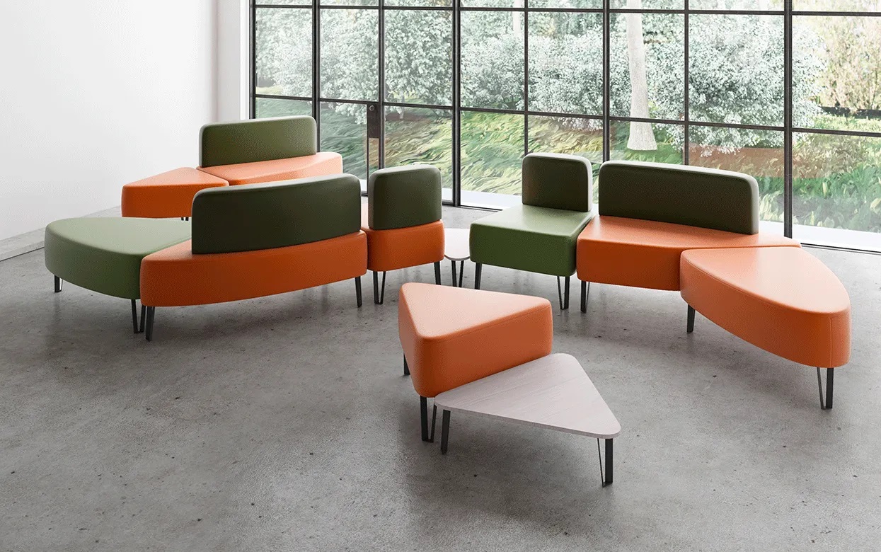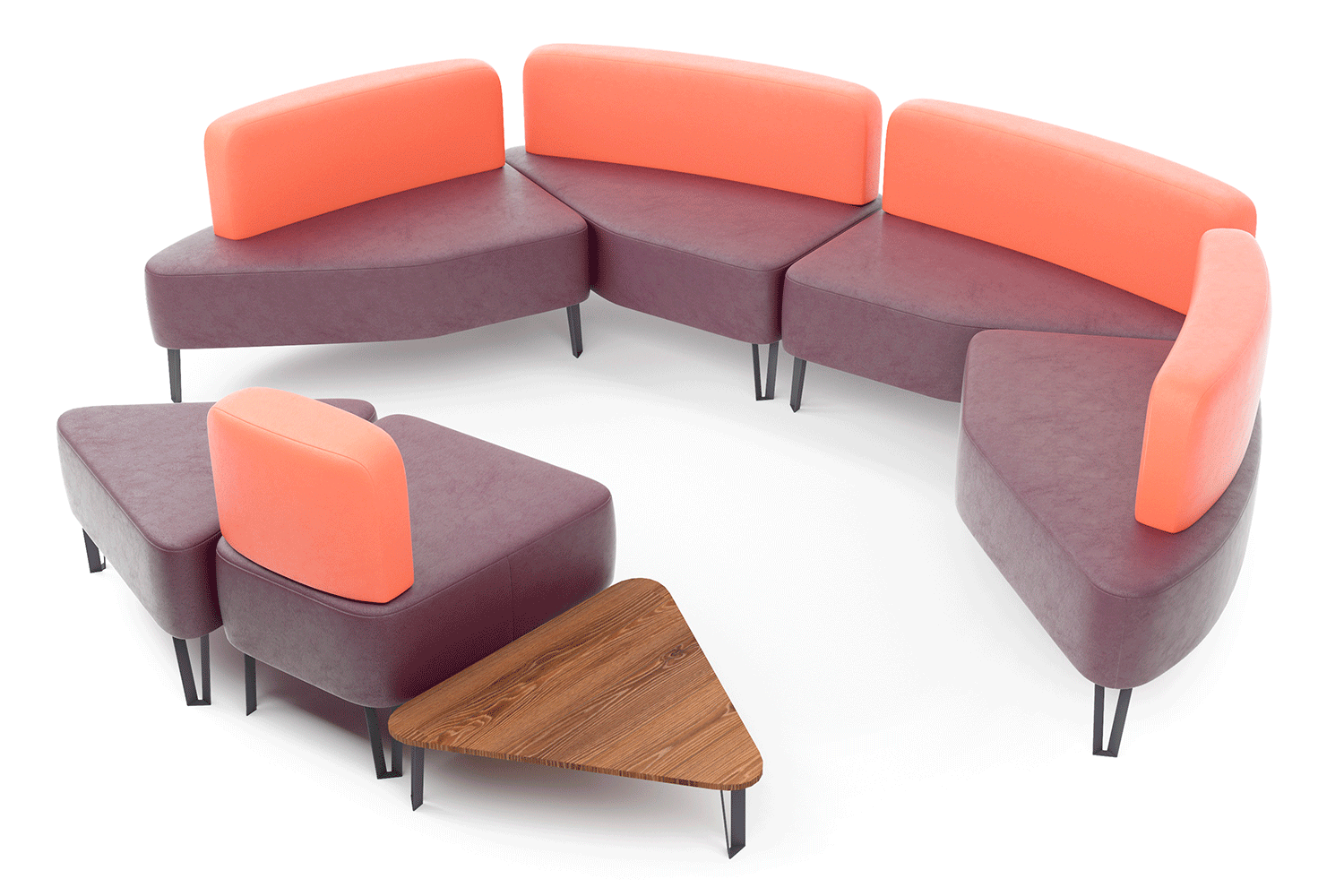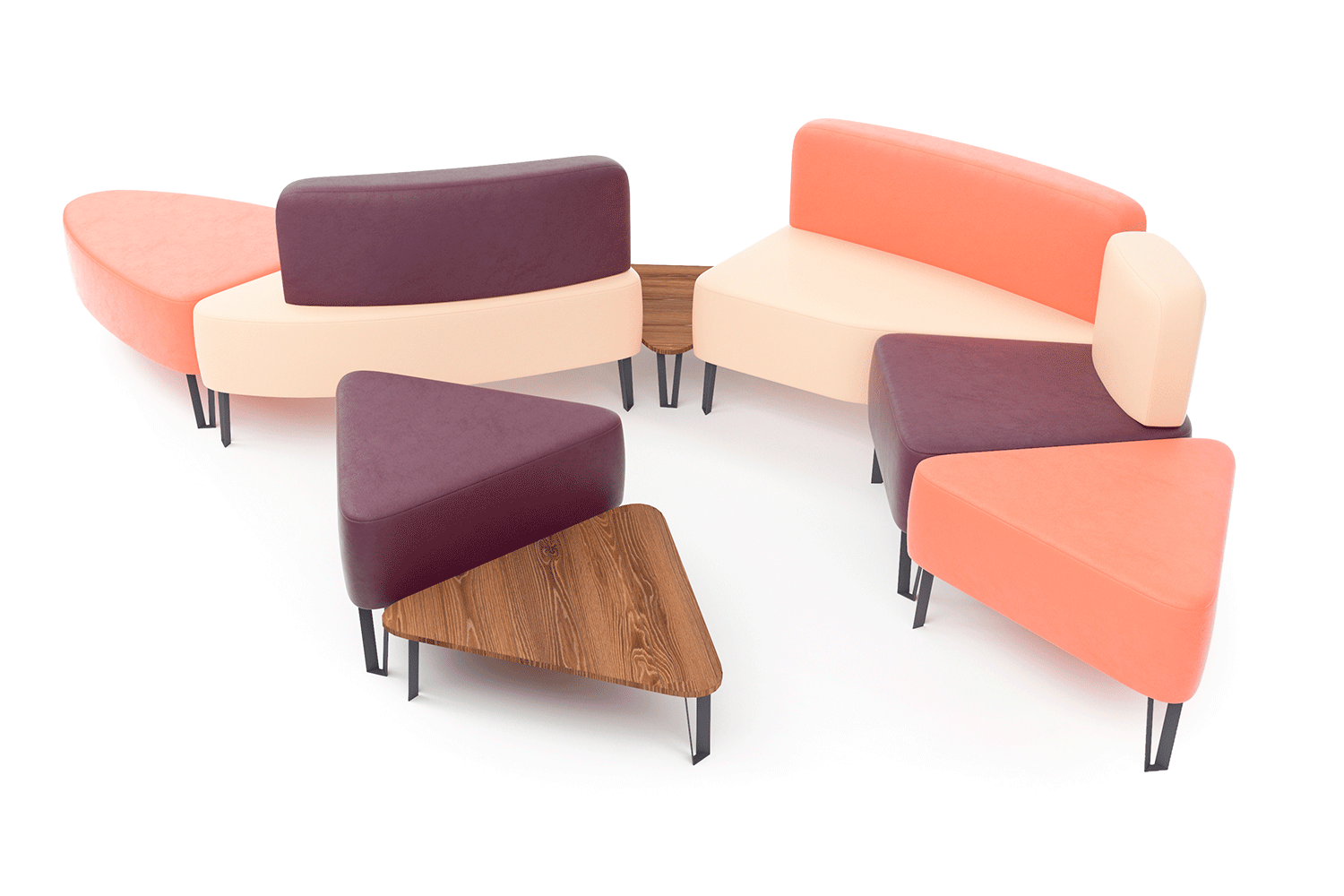 В серию входят модули со спинками, пуфы и столики разных форм, позволяющие реализовать несколько композиционных схем.