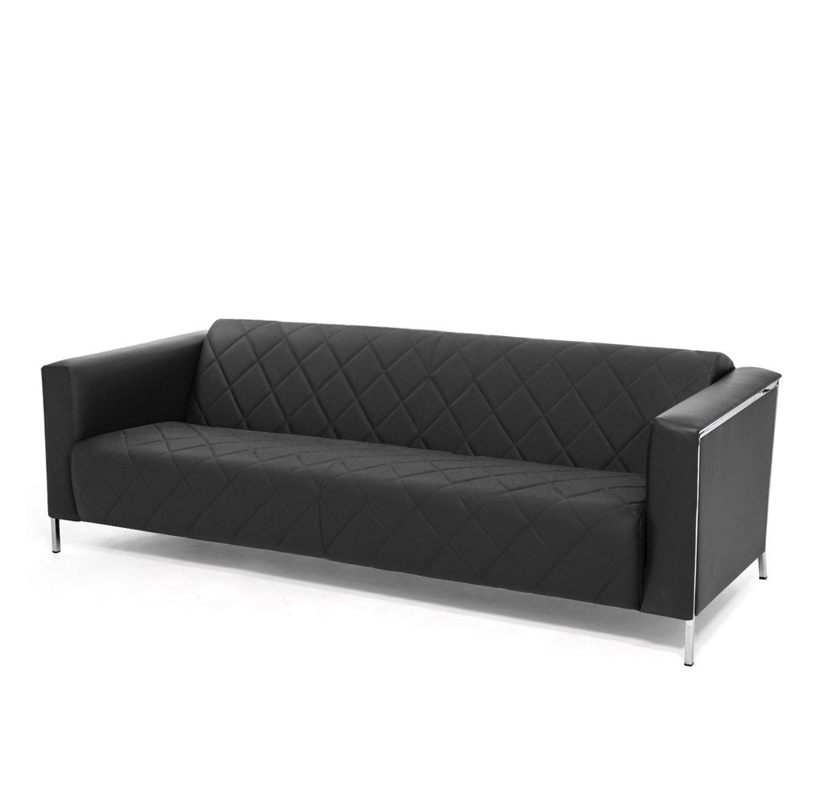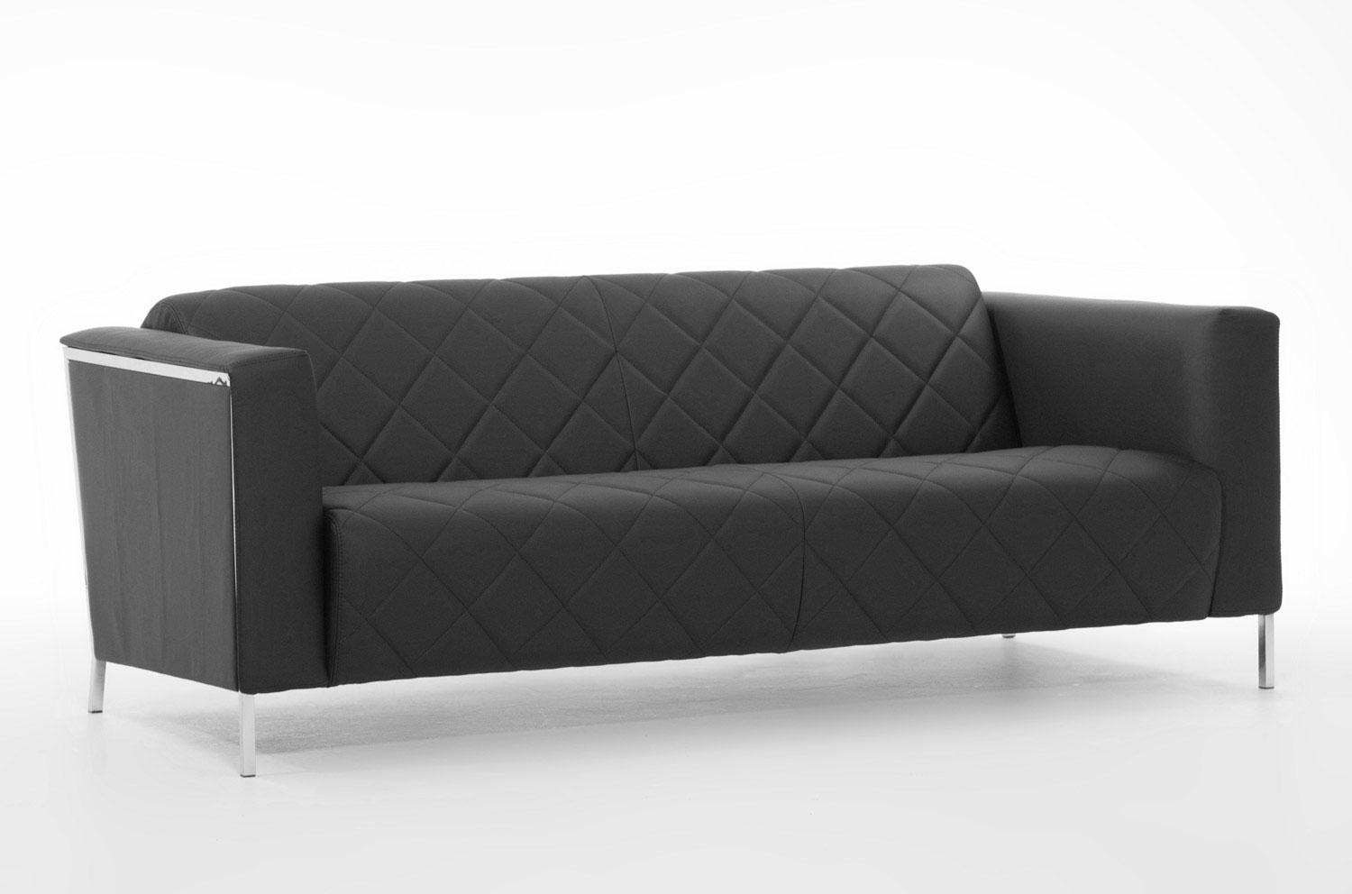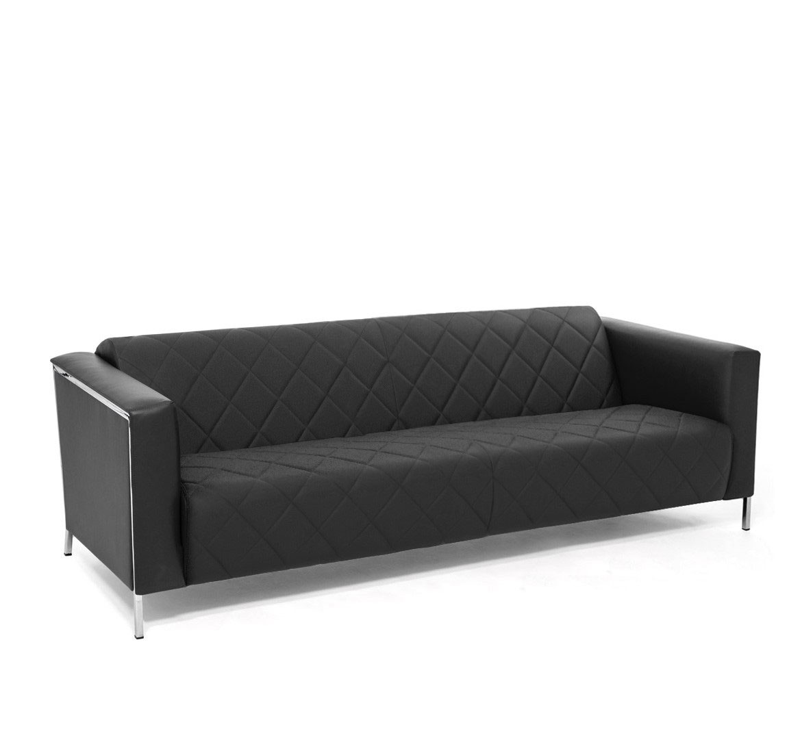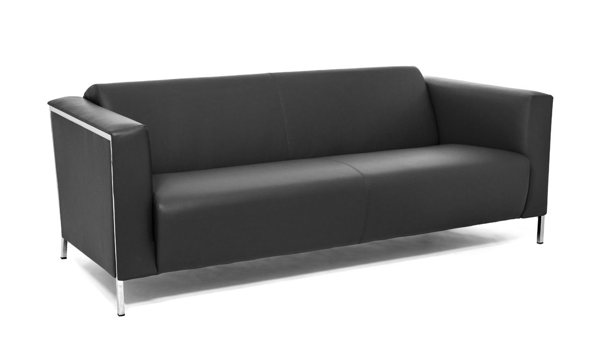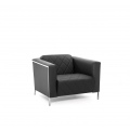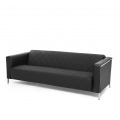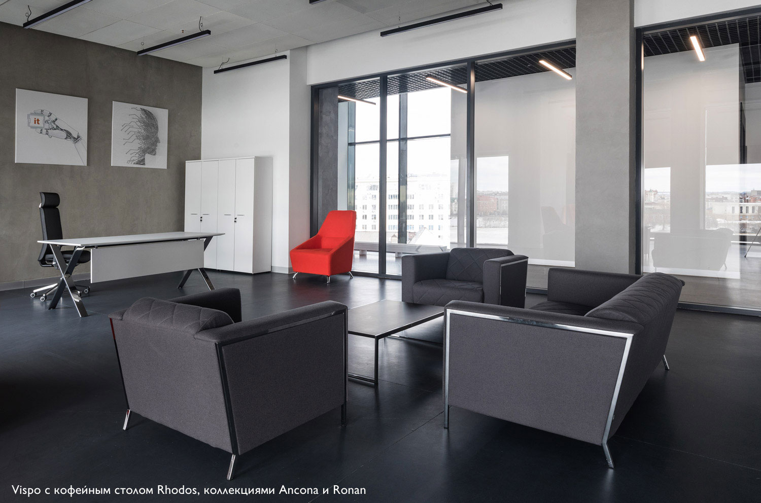Коллекция "Vispo" в складском ассортименте представлена двух- и трехместным диванами и креслом c декоративной прострочкой, выполненными в серой шерстяной ткани или в черной коже в сочетании с хромированными опорами.