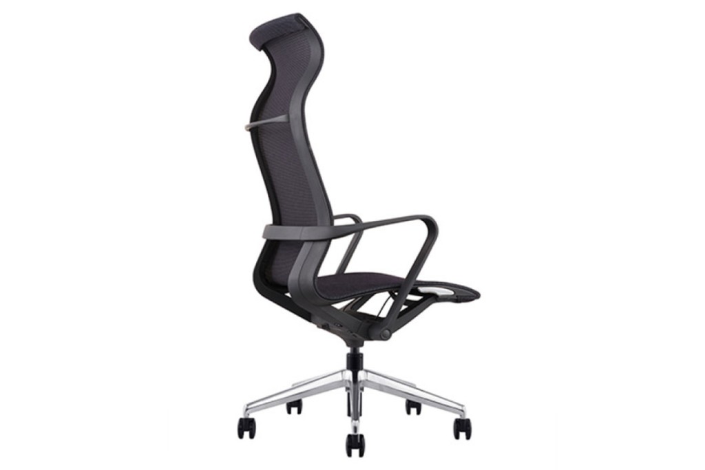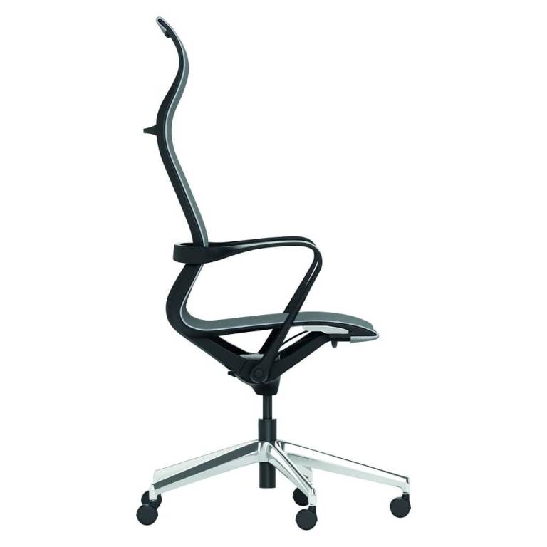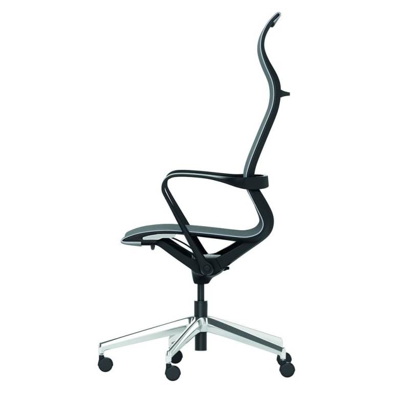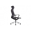 Кресло для руководителя, с высокой спинкой, обладает интегрированным подголовником, придающим общему силуэту запоминающуюся футуристичную форму.