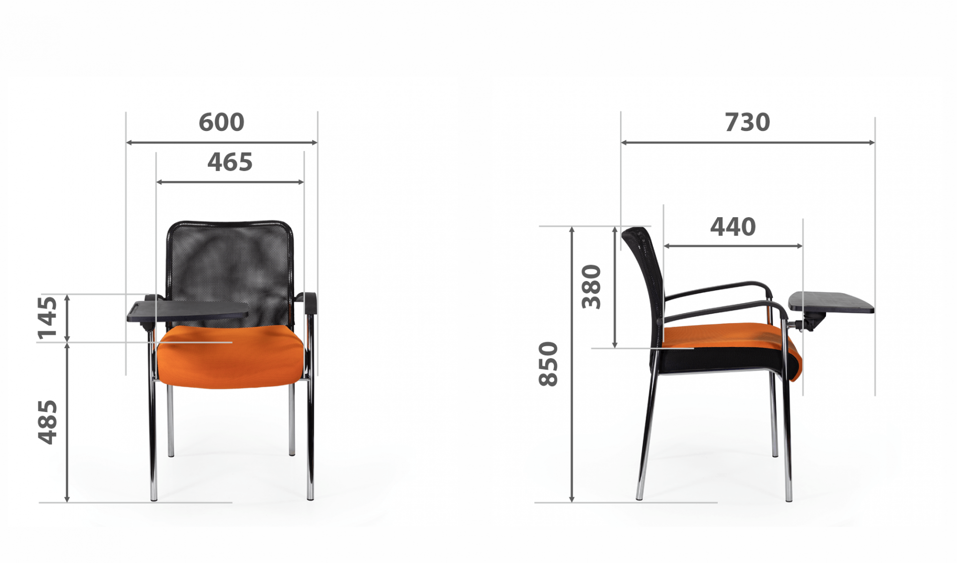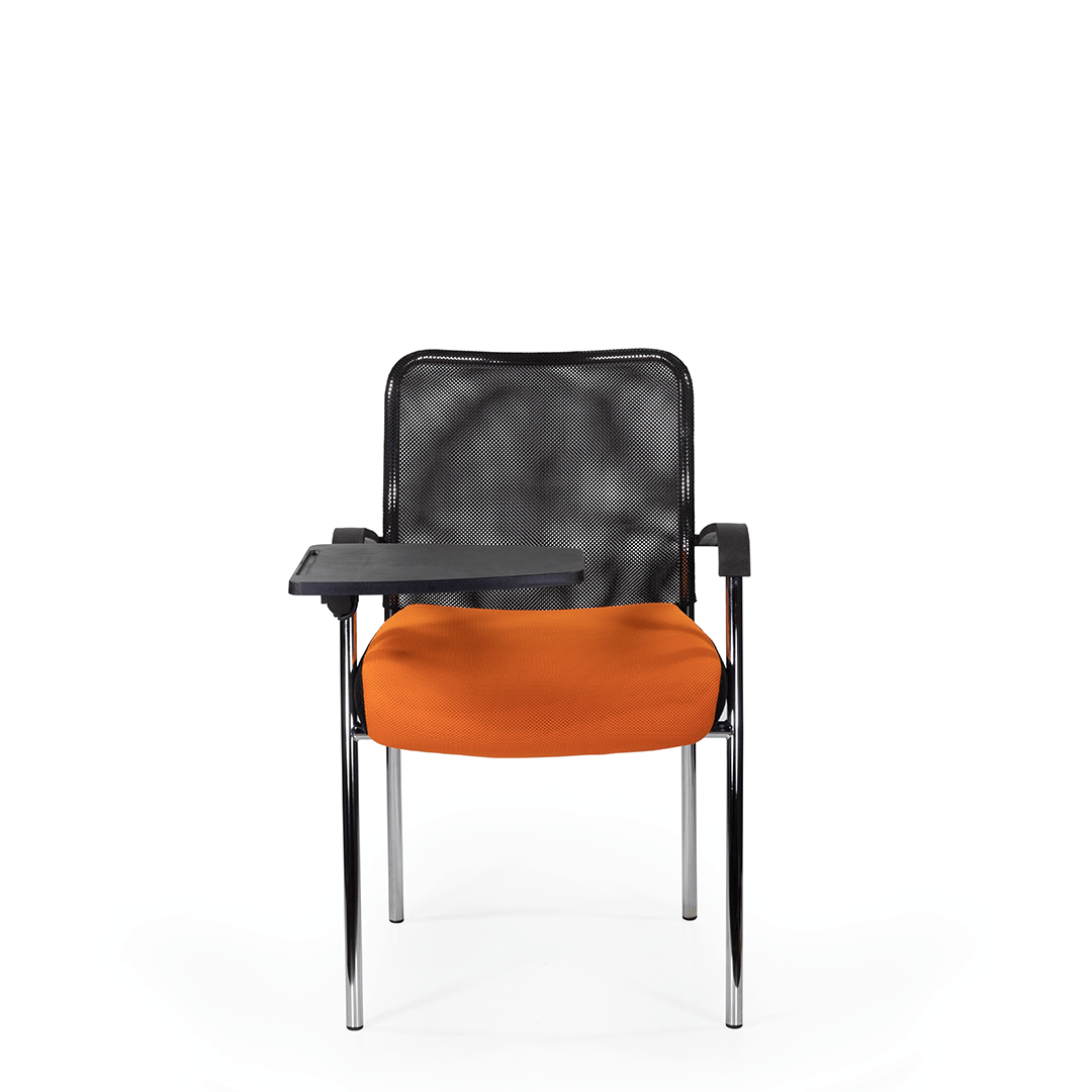 Кресло для посетителя изготавливается с мягким сиденьем, оригинальной спинкой, выполненной из сетчатой ткани и пластиковыми подлокотниками.