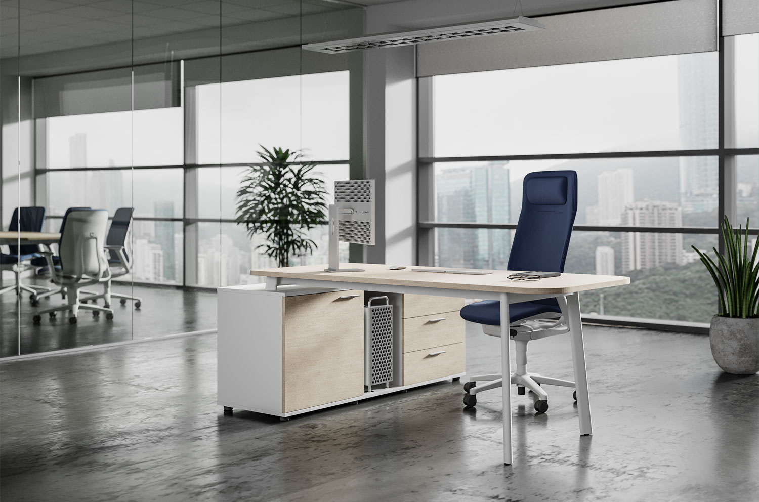 Опорная тумба может быть установлена как справа, так и слева, при этом столешница трапециевидной формы всегда крепится к опорной тумбе короткой стороной.