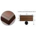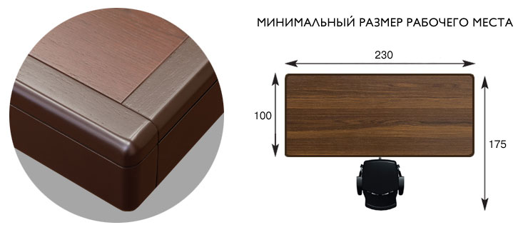 Вдоль кромки столешницы есть специальная накладка из массива дерева, что повышает износостойкость и прочность стола. Декоративная полоса опоясывает стол, придавая ему особенный вид. Углы стола специально закруглены. Толщина канта стола составляет 100 мм, благодаря этому стол визуально становится массивнее, также за счет такой толщины канта создается эффект, что столешница полностью накрывает стойки стола.