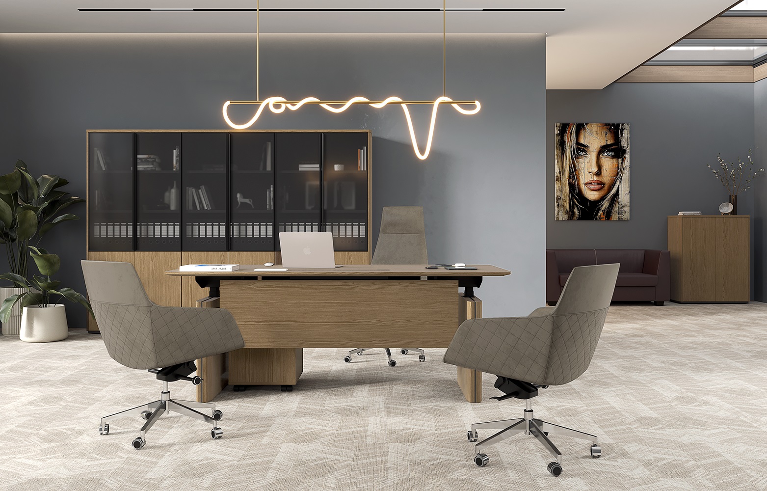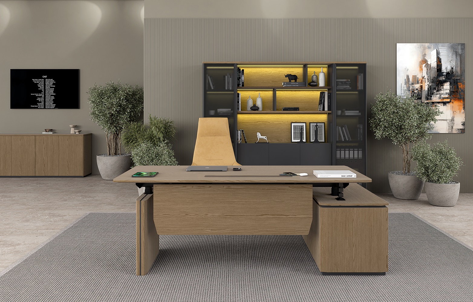 Подъемный электрический механизм в столах руководителя для работы «сидя-стоя» с памятью четырёх уровней высоты, которые легко устанавливаются кнопками, что создает дополнительный комфорт в течении рабочего дня.