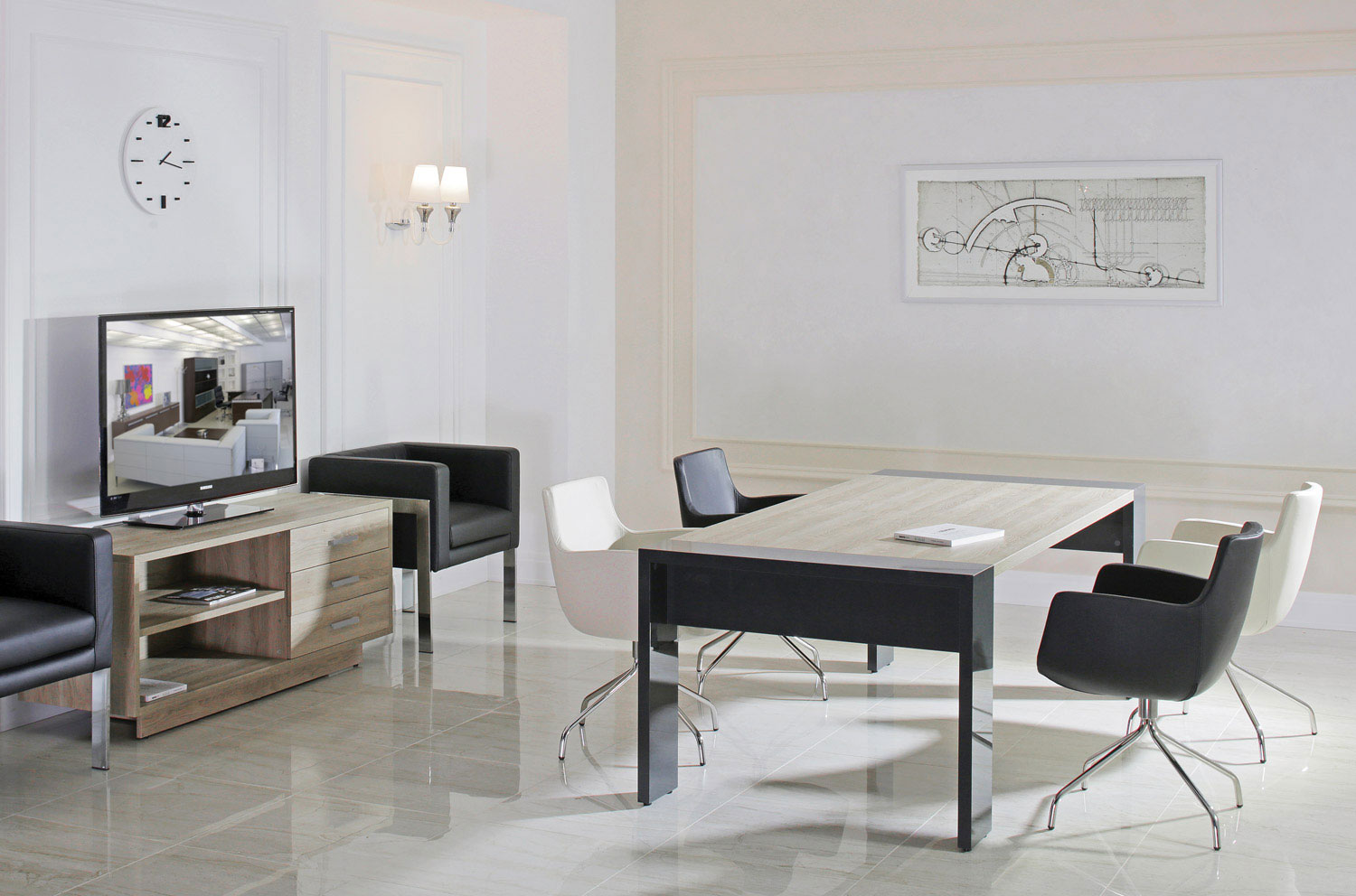 Функциональное решение для офиса включает два типа письменных столов, широкий ассортимент систем хранения и столов для переговоров.
