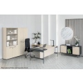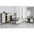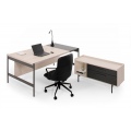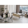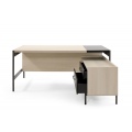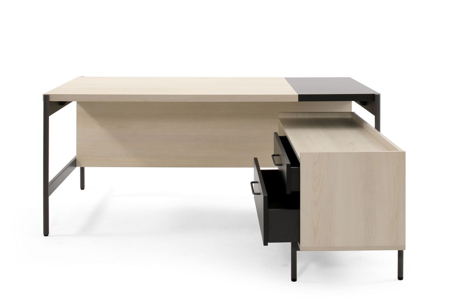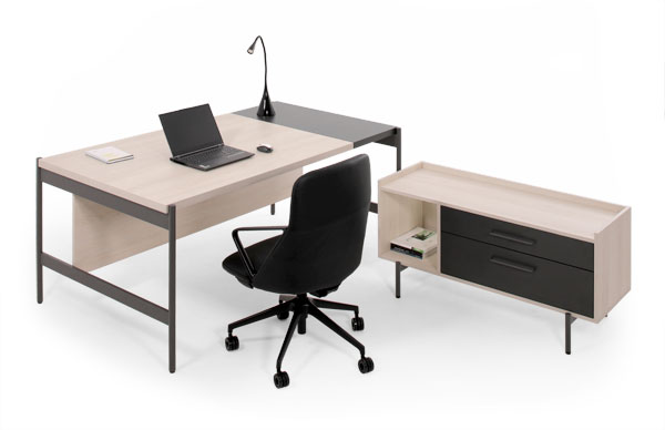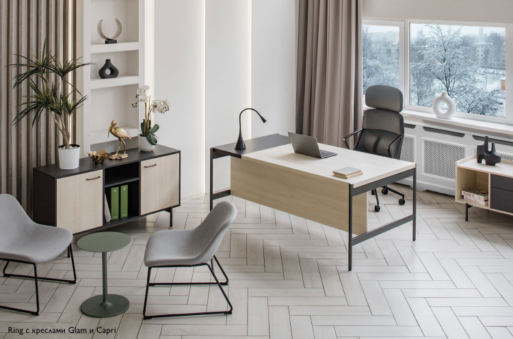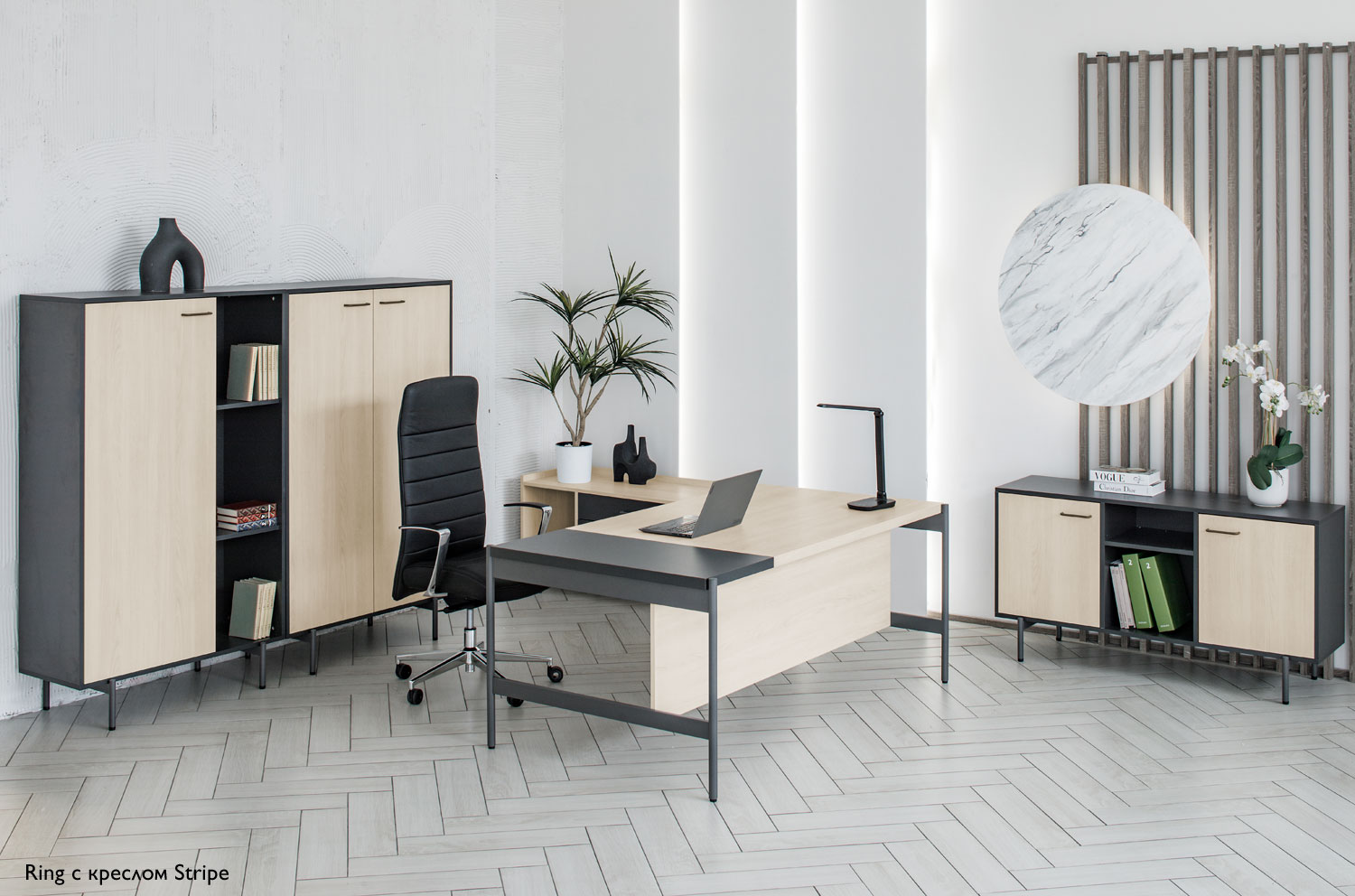 Светлый дуб мягко контрастирует с выразительным графитовым оттенком. Матовая поверхность антрацитовых металлических опор уравновешивает светлую столешницу и подчеркивает архитектуру кабинета. Все продумано, ни одной случайной линии, только чистые формы, честность в деталях и уважение к пространству.