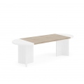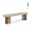 Стол размером 220х100 см имеет прямые опоры, объединенные с частью столешницы поперечным направлением рисунка дерева, отличным от продольного рисунка на центральной части столешницы.