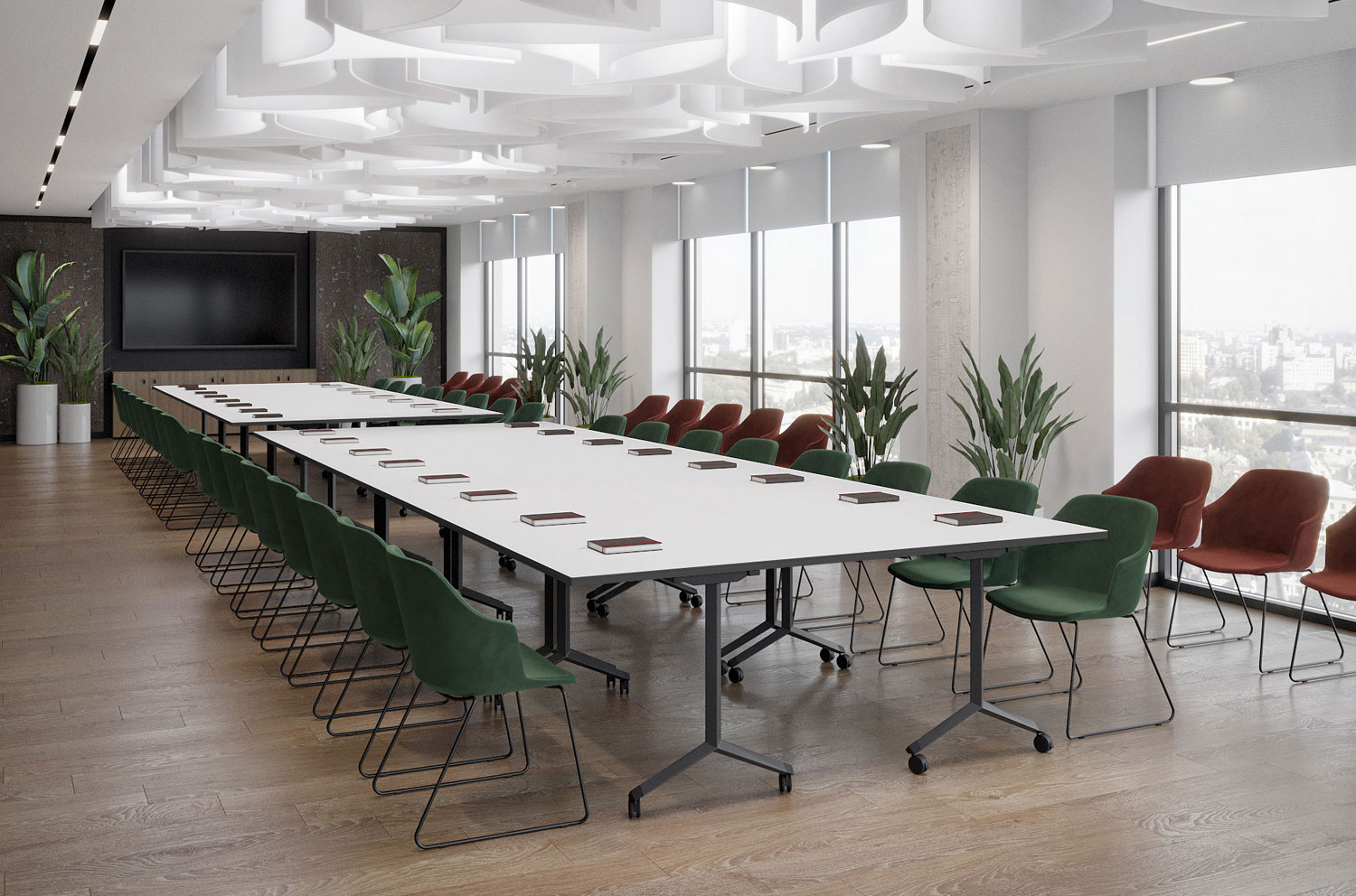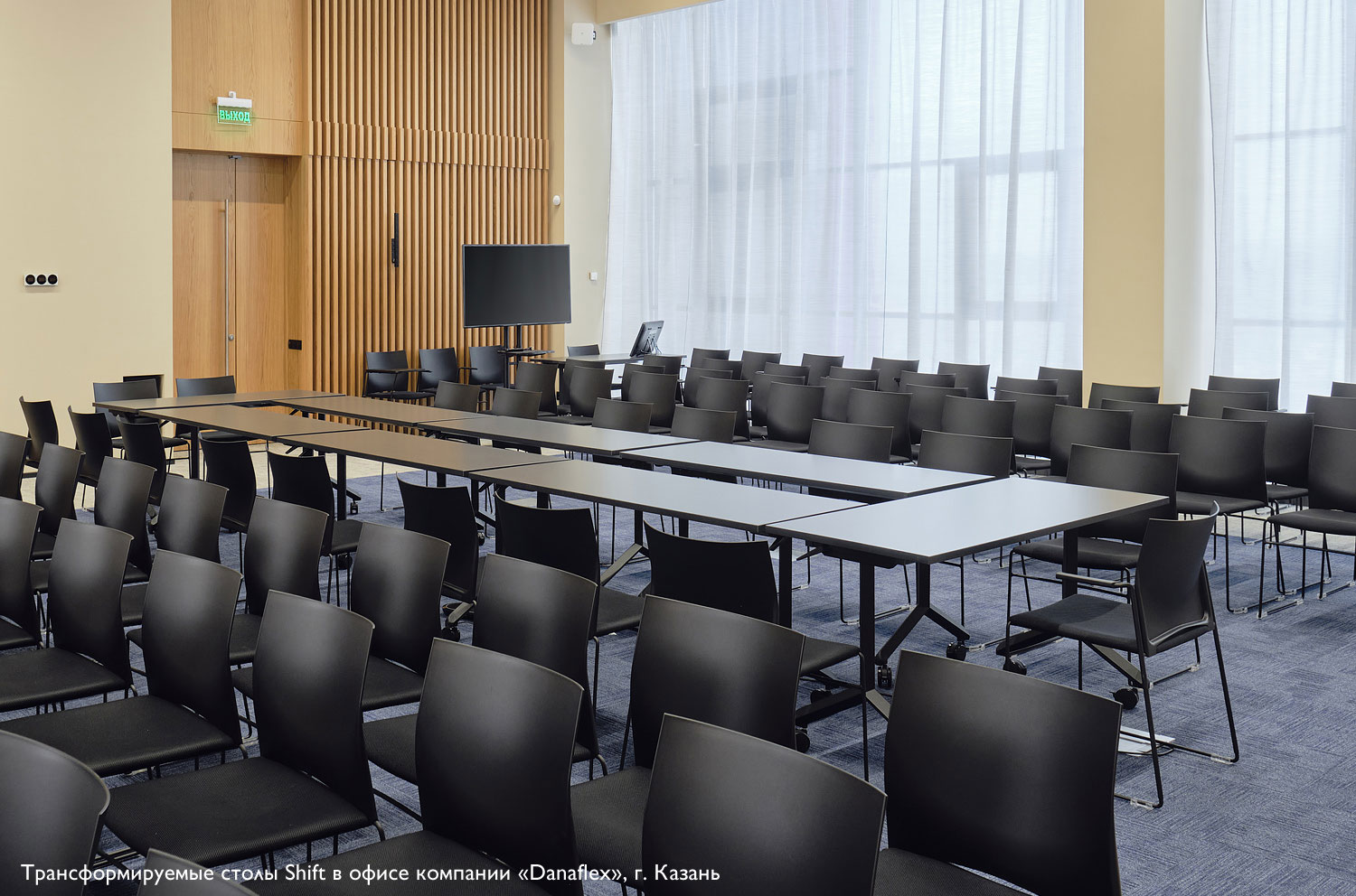 Одно и то же помещение может быть использовано для проведения конференций, тренингов, совещаний в малых рабочих группах, в качестве столовой.